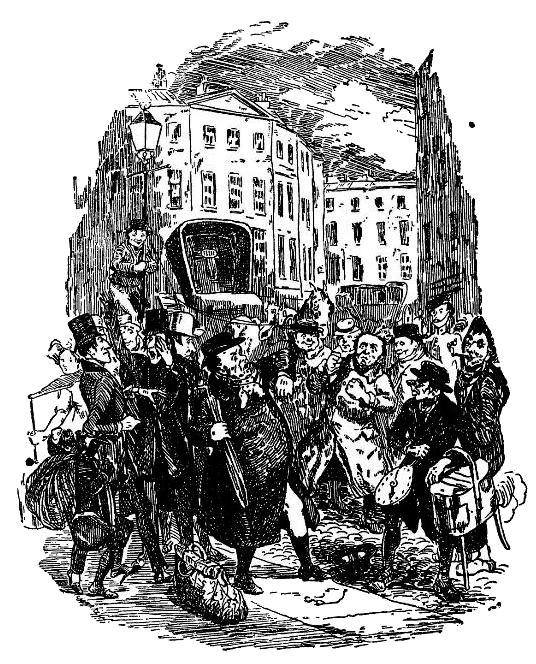 Возница соскочил, и мистер Пиквик вышел из кэба. Мистер Тапмен, мистер Снодграсс и мистер Уинкль, нетерпеливо ожидавшие прибытия своего славного вождя, подошли его приветствовать.