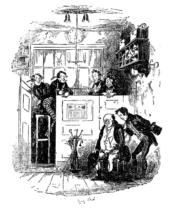 Внезапный звон колокольчика, висевшего в конторе, призвал мистера Джексона в кабинет Фогга; оттуда он вернулся и сказал, что он (Фогг) готов принять мистера Пиквика, если тот поднимется наверх.