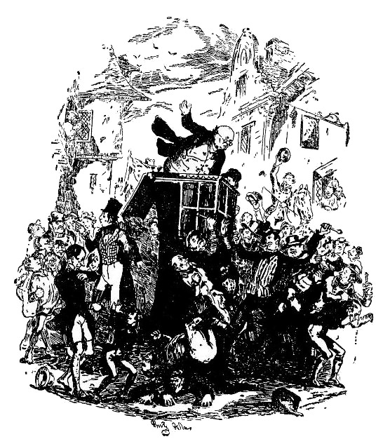 Мистер Уэллер в утренней куртке с черными коленкоровыми рукавами возвращался в довольно мрачном расположении духа после безрезультатного созерцания таинственного дома с зеленой калиткой, как вдруг, подняв глаза, узрел толпу, запрудившую улицу и окружавшую некий предмет, весьма похожий на портшез. Желая отвлечь мысли от своего неудачного предприятия, он отступил в сторону, чтобы поглазеть на толпу, и, убедившись, что она выражает восторг преимущественно для собственного своего удовольствия, немедленно начал (для поднятия своего духа) тоже орать изо всех сил.