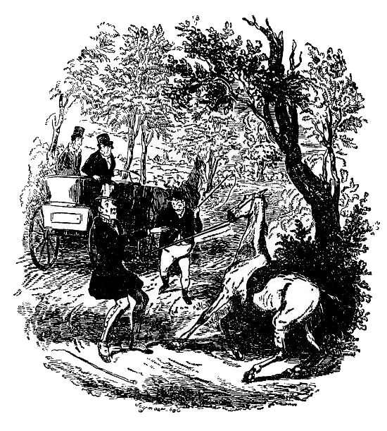 Мистер Пиквик – сама доброта и человеколюбие – бросил вожжи на спину своей лошади и, спустившись с козел, заботливо повернул повозку к придорожным кустам на тот случай, если кто проедет по дороге, после чего поспешил на помощь к своему злополучному спутнику, оставив мистера Тапмена и мистера Снодграсса в экипаже.