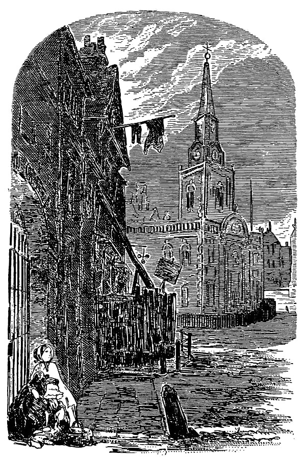 Крошка Доррит со своей спутницей повернула назад, к тюрьме, решив дождаться там, когда отопрут ворота, но стоять на сыром ветру было холодно, и, взяв за руку Мэгги, которая спала на ходу, Крошка Доррит повела ее дальше. Проходя мимо церкви, она увидела в полуотворенной двери свет и решилась заглянуть.