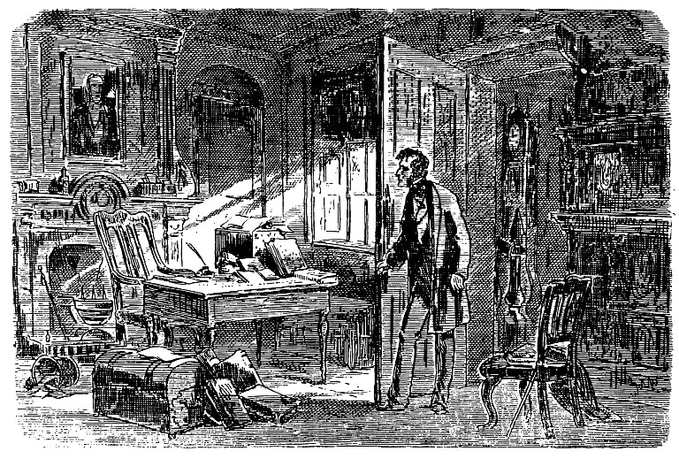 Большую часть дня Артур бродил по всему дому. Унылым и мрачным показался ему этот дом. Угрюмые комнаты, долгие годы пустовавшие, словно погрузились в тяжелый мертвый сон, который ничто уже не могло разогнать. Мебели было мало, но в то же время она загромождала помещение, и казалось, что все эти вещи забрели сюда, чтобы спрятаться, а не для того, чтобы служить обстановкой комнат. Глаз поражало отсутствие красок; мимолетные лучи солнца давным-давно похитили все краски этого дома – быть может, чтобы наделить ими цветы, бабочек, оперение птиц, драгоценные камни или еще что-нибудь. От подвала до чердака не нашлось бы ни одного ровного пола; потолки были покрыты такими фантастическими наростами копоти и грязи, что старухи могли бы гадать на них лучше, чем на кофейной гуще. Смертельный холод сковал камины, и единственным признаком того, что когда-то в них пылал огонь, были кучи сажи, насыпавшиеся из дымохода и черными облачками начинавшие кружиться по комнате, как только отворяли дверь. В зале, где когда-то принимали гостей, можно было увидеть два тусклых зеркала в рамах, по которым двигались траурные процессии черных человечков с гирляндами из черных цветов; впрочем, у многих участников этого погребального шествия не хватало голов или ног; один похожий на факельщика Купидон перевернулся и висел головой вниз, а другой и вовсе отвалился. Комната, служившая кабинетом покойному отцу Кленнэма, осталась совершенно такой, как она с детства запомнилась сыну; легко было вообразить, что он до сих пор незримо обитает здесь, как его вполне зримая вдова до сих пор обитает в своей комнате наверху и что Иеремия Флинтвинч по-прежнему ходит парламентером от одного к другому. С темного и мрачного портрета, висевшего на стене, в сосредоточенном безмолвии смотрело лицо мистера Кленнэма-старшего, и его взгляд, такой же настойчивый, как в час, когда последняя искра жизни догорала в нем, казалось, грозно напоминал сыну о взятом им на себя долге; но Артур уже отчаялся добиться чего-либо от матери; что же до других способов разрешить терзавшие его сомнения, то в них он отчаялся еще задолго до того. Подвалы дома, как и жилые комнаты, были полны вещей, знакомых Артуру с детства; все это изменилось и попортилось от времени, но все стояло на старых местах вплоть до порожних бочек из-под пива, окутанных паутиной, и пустых винных бутылок с тугим ошейником плесени вокруг горлышка. Здесь же среди ненужных бутылочных стоек, испещренных полосами бледного света, проникавшего сверху, со двора, была кладовая, заваленная старыми счетными книгами, и оттуда шел такой запах гнили и разложения, как будто целая армия престарелых конторщиков вставала каждую ночь из могилы и до рассвета занималась поверкою этих книг.