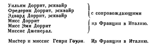 Они составляли весьма многочисленную партию, и хозяева гостиниц только что не молились на них. Первым прибывал на место курьер, чтобы велеть приготовить парадные комнаты, и все уже знали наперед, что едут важные гости. Курьер был герольдом семейного кортежа. За ним следовала большая дорожная карета, в которой ехали внутри: мистер Доррит, мисс Доррит, мисс Эми Доррит и миссис Дженерал; на запятках несколько слуг, а на козлах, рядом с кучером, Эдвард Доррит, эсквайр (в хорошую погоду). За каретой – тарантас с Фредериком Дорритом, эсквайром, и пустым местом для Эдварда Доррита, эсквайра (на случай дурной погоды). За тарантасом – фургон с остальной прислугой, громоздкой кладью и всей грязью и пылью из-под колес передних экипажей.