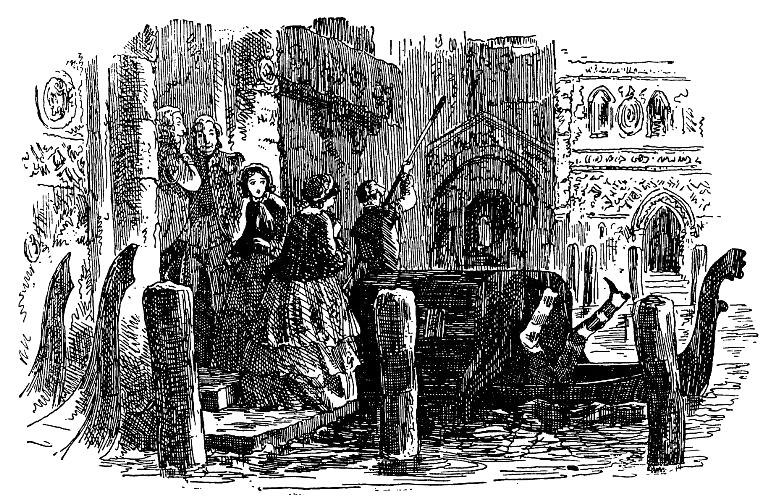 Крошка Доррит шла впереди с братом и миссис Дженерал (мистер Доррит предпочел остаться дома), но у самой воды все маленькое общество снова сошлось вместе. Увидев рядом с собой Бландуа, галантно помогавшего Фанни войти в гондолу, Крошка Доррит вздрогнула снова.