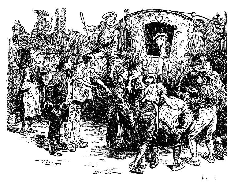 Господин маркиз в своей дорожной карете (сегодня она кажется особенно грузной), запряженной четверкой почтовых лошадей, с двумя форейторами, медленно поднимается по крутому склону. Лицо маркиза пылает, но эта краска не порочит его высокое происхождение; она вызвана не какой-нибудь тайной причиной, а чисто внешней, которая даже и не зависит от господина маркиза – это просто лучи заходящего солнца.