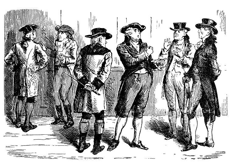 Стрелки на часах уже показывали время закрытия банка, и публика стала расходиться; эмигранты, не переставая болтать, толпой повалили к выходу мимо конторки мистера Лорри. Мистер Лорри, держа на виду письмо, переданное ему «самим», останавливал каждого проходившего. И каждый из этой толпы возмущенных, озлобленных беглецов, взглянув на конверт, бросал по-английски или по-французски какое-нибудь презрительное замечание по адресу пропавшего маркиза.