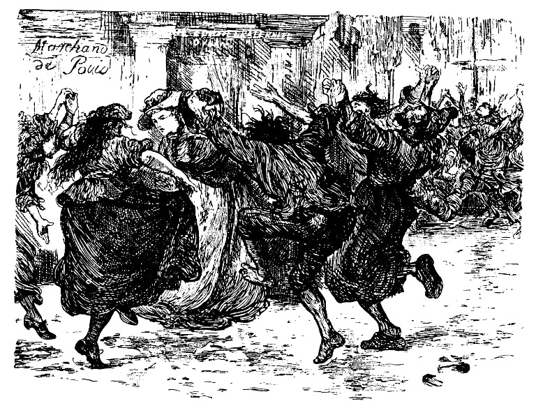 [Закрыть] с грозным отрывистым ритмом, напоминавшим какое-то дикое лязганье или скрежет зубовный. Схватившись за руки – мужчины с женщинами, женщины с женщинами, мужчины с мужчинами, – кружились кто с кем придется. Вначале даже нельзя было разобрать, что это пляска; казалось, это какой-то бешеный вихрь стремительно мелькающих красных колпаков и пестрых лохмотьев. Но когда вся толпа вышла на открытое место и закружилась перед тюрьмой, что-то похожее на фигуры какого-то дикого неистового танца стало проступать в этом круженье. Став друг против друга, они сходились, потом, отпрянув назад, ударяли друг дружку в ладоши, хватали друг друга за головы и, снова отпрянув, кружились сначала в одиночку, потом, схватившись за руки, парами, все быстрей и быстрей, пока многие не падали в изнеможенье; тогда, сомкнувшись в хоровод, толпа кружила вокруг упавших, затем распадалась на маленькие кружки; кружились четверками, парами, а потом вдруг все сразу останавливались; и опять все начиналось сначала, сходились, отпрядывали, хлопали в ладоши и снова принимались кружиться в другую сторону. Наконец, когда они уже в который раз внезапно остановились, на минуту водворилась тишина; потом, хлопнув в ладоши, они снова затянули песню, грозно отбивая такт, построились в колонну, во всю ширину улицы, и, опустив головы и вскинув руки, с воем ринулись дальше.