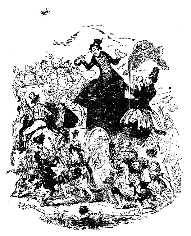 Этого было достаточно, чтобы рассердить любого джентльмена, наделенного, подобно мистеру Пиквику, чувством приличия, но положение ухудшилось еще благодаря тому, что как раз в этот момент они, повстречались с пассажирской каретой, битком набитой и внутри и снаружи, пассажиры которой явно выражали свое удивление. Вдобавок восторженные возгласы ирландской семьи, бежавшей за каретой мистера Пиквика и клянчившей милостыню, не отличались сдержанностью. Особенно изощрялся глава семьи, вообразивший, будто видит перед собой неотъемлемую часть политической или какой-нибудь иной торжественной процессии.
