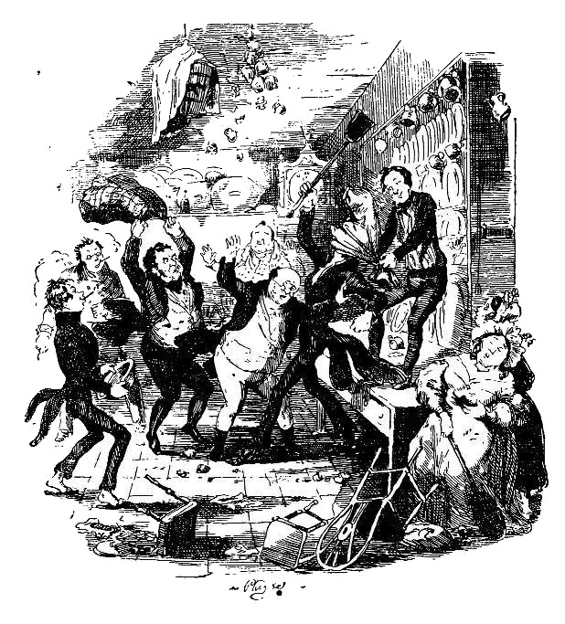 – Джентльмены! – закричал мистер Пиквик, когда Потт, вскочив, схватил совок. – Джентльмены! Опомнитесь, ради бога!.. Сэм!.. Прошу вас, джентльмены!.. Да разнимите же их!