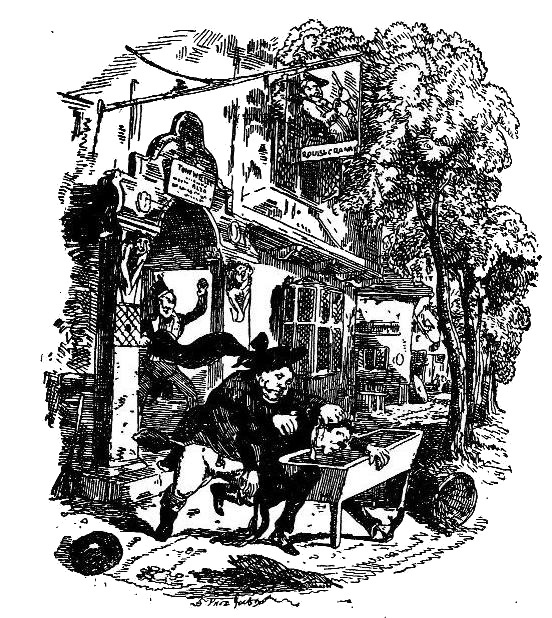 Считая неделикатным представить молодой чете Боба Сойера или Бена Эллена, не предупредив ее об их прибытии, и желая, щадить по мере сил чувства Арабеллы, мистер Пиквик сказал, что он с Сэмом поедет в гостиницу «Джордж и Ястреб», а молодые люди временно остановятся где-нибудь в другом месте. На это они охотно согласились, и план был приведен в исполнение: мистер Бен Эллен и мистер Боб Сойер отправились на окраину Боро в уединенный трактир, где в былые дни их имена частенько красовались за дверью буфетной, возглавляя написанные мелом длинные и запутанные вычисления.