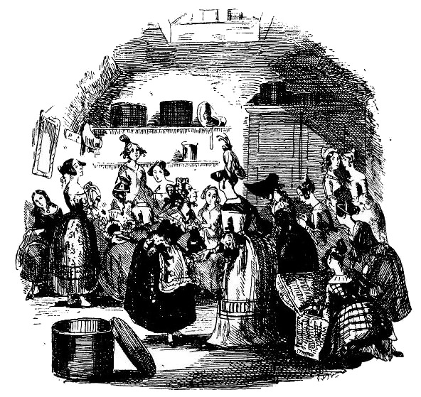 Один из таких двойных ударов в дверь мадам Манталини дал знать о прибытии экипажа некоей знатной леди – или, вернее, богатой, ибо бывает иногда разница между богатством и знатностью, – которая приехала вместе с дочерью примерить давно заказанные придворные туалеты; и обслуживать их была послана Кэт в сопровождении мисс Нэг и, разумеется, под командой мадам Манталини.