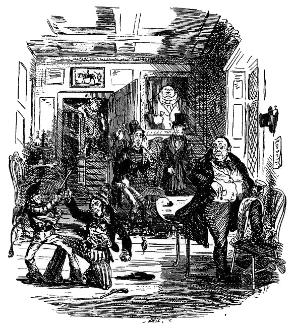 Николас приготовился увидеть нечто странное, однако же не столь странное, как зрелище, представившееся его глазам. В дальнем конце комнаты два подростка, один весьма рослый, а другой малорослый, оба одетые матросами – или по крайней мере театральными матросами, с поясами, пряжками, косицами и пистолетами, – были погружены в занятие, которое на афишах называется страшным поединком: они орудовали двумя короткими палашами, какими обычно пользуются в наших второстепенных театрах. Малорослый одерживал верх над рослым, который очутился в смертельной опасности, и за обоими наблюдал большой грузный мужчина, примостившийся на углу стола; мужчина энергически заклинал их выбивать побольше искр из палашей, и тогда они на первом же представлении не преминут потрясти весь зал.