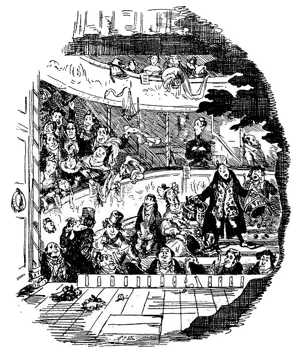Наконец оркестр умолк, и занавес поднялся. Первая сцена, в которой не участвовал никто примечательный, прошла довольно спокойно, но когда во второй появилась мисс Сневелличчи, сопровождаемая феноменом в роли дитяти, какой раздался гром аплодисментов! В ложе Борума все встали, как один человек, размахивая шляпами и носовыми платками и крича: «Браво!». Миссис Борум и гувернантка бросали венки на сцену, из коих некоторые опустились на лампы, а один увенчал чело толстого джентльмена, который, жадно смотря на сцену, остался в неведении об оказанной ему чести; портной и его семейство колотили ногами в переднюю стенку верхней ложи, грозя вывалиться наружу; даже мальчик, разносивший имбирное пиво, застыл на месте посреди зрительного зала; молодой офицер, которого считали влюбленным в мисс Сневелличчи, вставил в глаз монокль, как бы желая скрыть слезу. Снова и снова мисс Сневелличчи приседала все ниже и ниже, и снова и снова аплодисменты раздавались все громче и громче. Наконец, когда феномен взял один из дымящихся венков и косо нахлобучил на самые глаза мисс Сневелличчи, овация достигла своего апогея, и представление продолжалось.