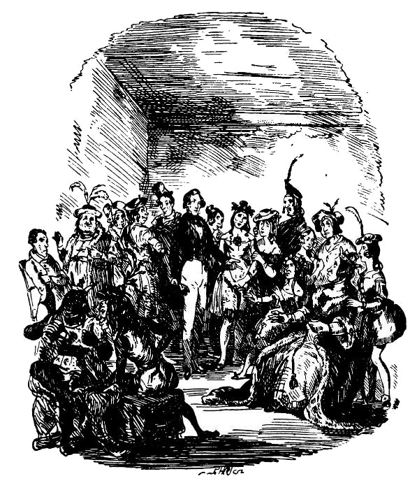 Леди были на стороне Николаса, а джентльмены (будучи ревнивы) оказались на стороне разочарованного трагика; поэтому последние образовали маленькую группу вокруг грозного мистера Ленвила, а первые наблюдали издали не без трепета и волнения. Когда Николас остановился, чтобы поздороваться с ними, мистер Ленвил презрительно захохотал и высказал общие замечания о природе щенят.