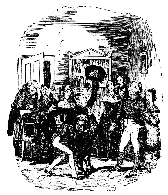 Это случайное обстоятельство послужило сигналом для весьма решительных действий. В разгар шума, вызванного просьбами и мольбами Смайка, воплями и восклицаниями женщин и бурными пререканиями мужчин, сделаны были попытки насильно увести блудного сына. Сквирс уже потащил его к порогу, но Николас (который до сей поры явно колебался, как поступить) схватил Сквирса за шиворот и, встряхнув так, что зубы, еще оставшиеся у того во рту, зашатались, вежливо проводил его до двери и, вышвырнув в коридор, захлопнул за ним дверь.