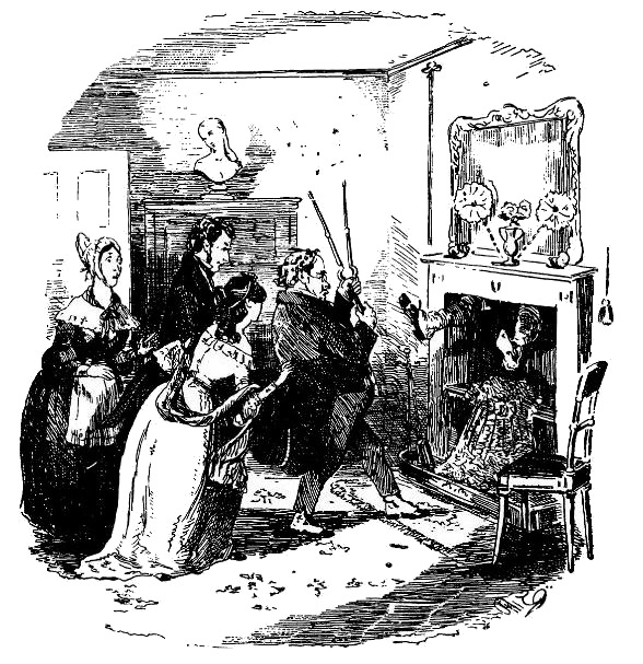 Однако изумление славной леди еще не достигло своего предела. Оно чрезвычайно возросло, когда выяснилось за ужином, что у Кэт нет ни малейшего аппетита, – открытие столь волнующее, что неизвестно, в каких красноречивых фразах излились бы опасения миссис Никльби, если бы всеобщее внимание не было привлечено в тот момент очень странным и необычным шумом, исходившим, как утверждала бледная и дрожащая служанка и как казалось всем присутствующим, «прямо» из дымохода камина в соседней комнате.