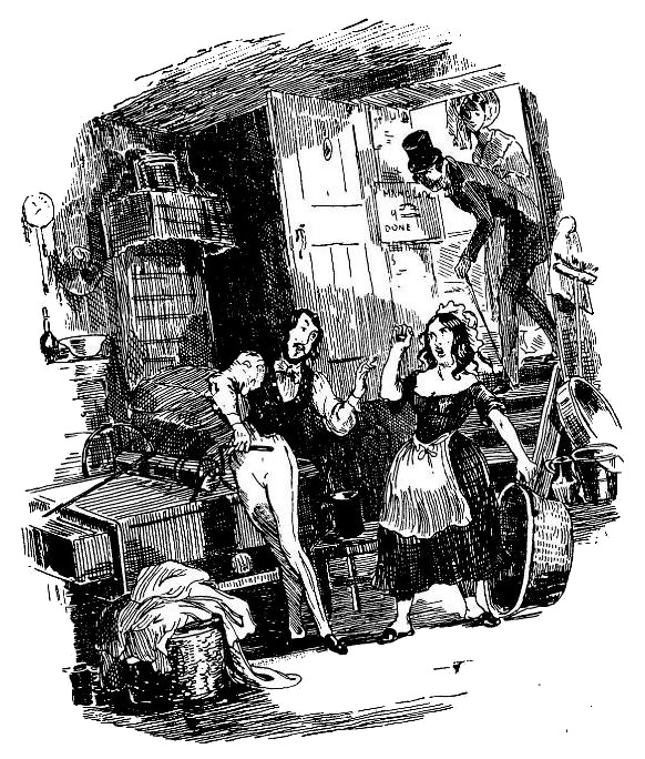 Увлекая ее за собой, Николас пробрался вниз и заглянул в маленький погреб с дощатым настилом. Здесь, среди белья и корзин стоял без сюртука, но все еще в прежних – теперь заплатанных – брюках превосходнейшего покроя, в некогда ослепительном жилете и украшенный, как в былые времена, усами и бакенбардами, ныне утратившими искусственный глянец, – здесь стоял, пытаясь утишить гнев бойкой особы – не своей законной супруги, мадам Манталини, но хозяйки прачечного заведения, – изо всех сил вертя при этом ручку катка, скрип которого, сливаясь с ее пронзительным голосом, казалось, почти оглушал его, – здесь стоял грациозный, элегантный, обаятельный и некогда неукротимый Манталини.