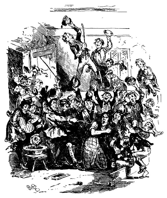 Это было утро серы и патоки, и миссис Сквирс, по обыкновению, вошла в классную комнату с большой миской и ложкой в сопровождении мисс Сквирс и любезного Уэкфорда, который в отсутствие отца принял на себя исполнение некоторых второстепенных – обязанностей – лягал учеников ногой в подбитом гвоздями башмаке, дергал за волосы младших мальчиков, других щипал за чувствительные места и многими подобными же выходками доставлял радость и утешение своей матери. Их появление в классе – то ли по сговору, то ли непреднамеренно – послужило сигналом к восстанию. В то время как один отряд ринулся к двери и запер ее, а другой взобрался на столы и скамьи, самый здоровый мальчик (то есть – принятый в школу последним) схватил палку и, с суровым видом подступив к миссис Сквирс, сорвал с нее чепец и касторовую шляпу, напялил их себе на голову, вооружился деревянной ложкой и приказал миссис Сквирс под страхом смерти опуститься на колени и немедленно принять дозу лекарства. Не успела достойная леди опомниться и оказать сопротивление, как толпа мучителей уже поставила ее на колени и принудила проглотить полную ложку отвратительной смеси, оказавшейся более пикантной, чем обычно, благодаря тому, что в миску погрузили голову юного Уэкфорда, каковая процедура была поручена еще одному мятежнику. Успех этой первой выходки побудил озлобленную толпу мальчишек, худые, голодные лица которых были одно безобразнее другого, перейти к дальнейшим противозаконным действиям. Вожак настаивал на том, чтобы миссис Сквирс приняла второю дозу, а юный Сквнрс подвергся вторичному погружению в патоку, и мальчики ужо начали яростно штурмовать мисс Сквирс, когда Джон Брауди, энергическим пинком вышиб дверь и бросился на помощь. Крики, вопли, стоны, гиканье, хлопанье в ладоши мгновенно стихли, и спустилось мертвое молчание.