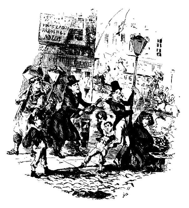 Смайк слишком хорошо знал этот голос. Он с отчаянием посмотрел вниз на того, чей голос услышал, и, задрожав с головы до ног, оглянулся. Мистер Сквирс зацепил его ручкой зонта за шиворот и, собрав все силы, повис на другом конце. Торжествующий крик исходил от юного Сквирса, который, невзирая на все пинки и сопротивление, цеплялся за него с упорством бульдога.