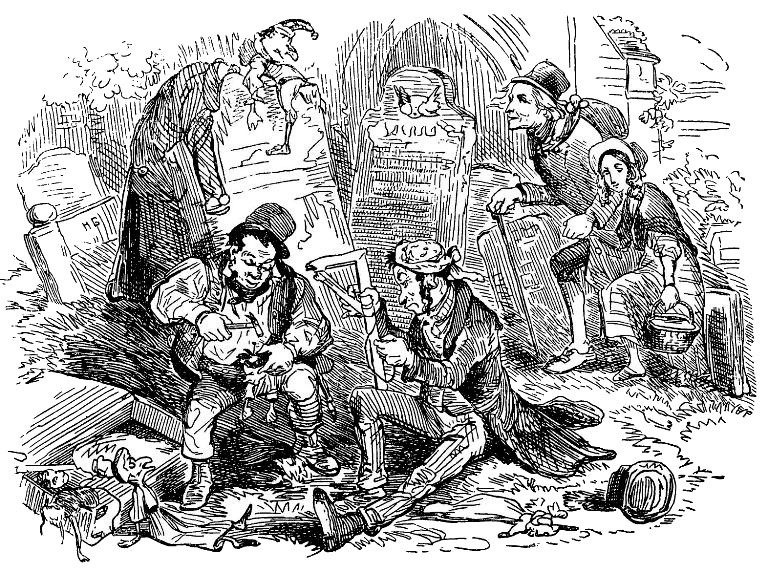 Два человека, удобно расположившиеся на траве, так были поглощены своим делом, что не сразу заметили подошедших. Люди эти видимо, принадлежали к братству бродячих комедиантов – к той их разновидности, которая показывает проделки Панча, ибо сей герой с крючковатым носом, и подбородком, и сияющей физиономией, скрестив ноги, восседал на памятнике позади них. Невозмутимость нрава этого персонажа, может быть, никогда еще не проявлялась с большей очевидностью, потому что привычная улыбка не сходила с его уст, хотя сидел он в крайне неудобной позе, поникнув всем своим бесформенным, хлипким телом и свесив длинный колпак на несуразно тонкие ноги, с риском каждую минуту потерять равновесие и упасть вниз головой.