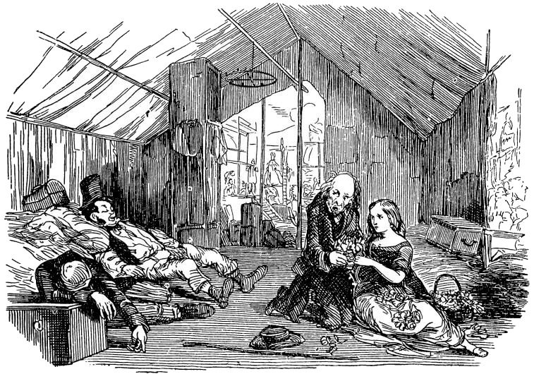 Наконец, уже совсем к вечеру, мистер Кодлин выбрал еще одно подходящее местечко – и вскоре представление было в самом разгаре. Девочка сидела вместе со стариком позади ширм и думала: «Странно! Почему это лошади, такие красивые благородные существа, притягивают к себе всякий сброд?» – как вдруг громкий хохот, вызванный экспромтом Коротыша, имевшим прямое отношение к событиям этого дня, заставил ее очнуться от раздумья и оглядеться по сторонам.