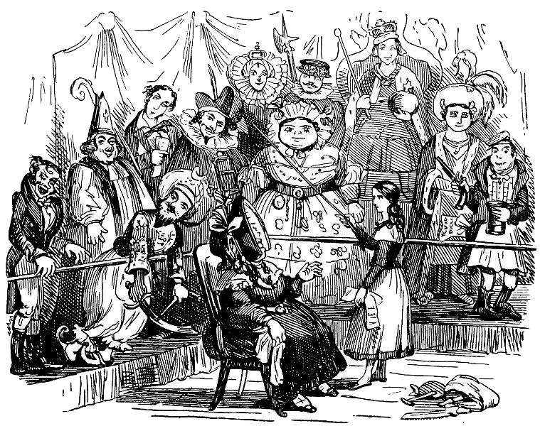 Миссис Джарли не поскупилась на похвалы своей маленькой приятельнице и ученице, достигшей такого блестящего успеха, и повела ее осматривать убранство соседнего с залом коридора, который уже был превращен в кущу из зеленого сукна, увешанную знакомыми Нелл надписями (творениями мистера Слама). У входа в эту кущу стоял пышно разукрашенный стол, и за ним миссис Джарли должна была собирать деньги с публики, восседая в обществе его величества короля Георга III[44]44