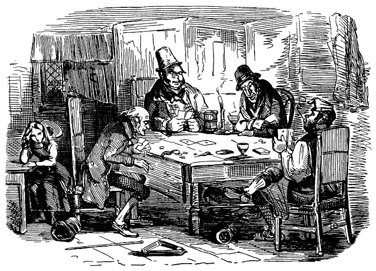 Трактирщик, которому, видимо, не впервые приходилось принимать участие в такой игре, подошел к столу и занял свое место. Девочка, полная отчаяния, отошла с дедом в сторону, надеясь, что ей удастся уговорить его и увести отсюда.