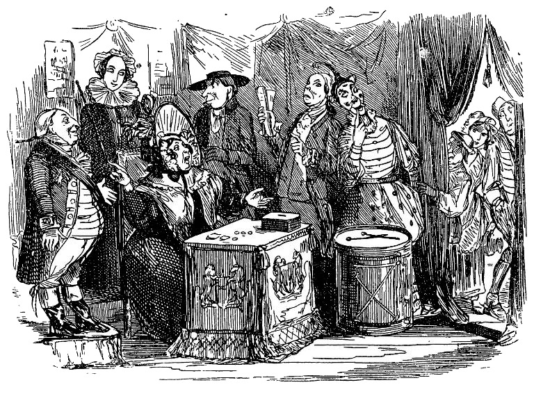 На следующий день, ровно в полдень, миссис Джарли уселась за пышно убранный стол, в окружении уже известных нам знаменитостей, и приказала распахнуть двери паноптикума для взыскательных и просвещенных зрителей. Однако первый день не принес ожидаемого успеха, так как широкая публика, выказывавшая живой интерес к самой миссис Джарли и к тем восковым персонам из ее свиты, которых можно было обозревать безвозмездно, не испытывала ни малейшего желания платить за вход по шести пенсов с носа. И невзирая на то, что зеваки глазели на выставленные у входа фигуры с необычайным долготерпением, часами изучали афиши и слушали шарманку, невзирая на то, что они любезно советовали всем друзьям и знакомым следовать их примеру, вследствие чего у дверей паноптикума толпилось чуть ли не полгорода, причем первой половине, едва она покидала свой пост, приходила на смену вторая, – невзирая на все это, в казне миссис Джарли не прибавлялось ни единого пенни, и перспективы, открывающиеся перед ее музеем, были отнюдь не радужны.