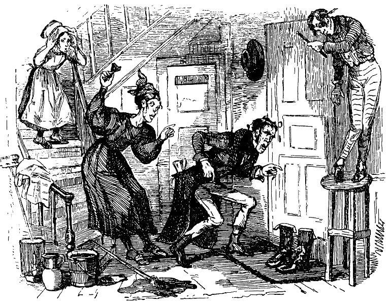 Покуда мистер Брасс вперял любопытный взор в замочную скважину, окриками стараясь привлечь внимание жильца, и покуда мисс Брасс трезвонила в колокольчик, мистер Свивеллер успел взобраться на табуретку, придвинутую вплотную к стене, у самой двери, и, вытянувшись на ней во весь рост, с тем расчетом, что разъяренный жилец не заметит его, если выбежит из комнаты, начал отчаянно лупить линейкой по притолоке. Восторгаясь собственной изобретательностью и веря в надежность своей позиции, избранной им по примеру тех бесстрашных личностей, что открывают двери галерки и задних рядов партера в дни битковых сборов, мистер Свивеллер совершенно заглушил ударами линейки звон колокольчика, и маленькая служанка, которая стояла на нижней ступени, готовая в любую минуту обратиться в бегство, заткнула уши, чтобы не оглохнуть на веки вечные.