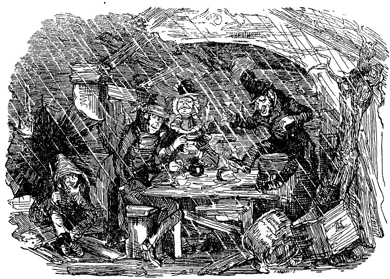 Погода в тот день не слишком-то располагала к чаепитию в беседке, тем более в такой, которая дошла до крайней степени ветхости и в часы отлива открывала вид на илистые береговые откосы Темзы. Тем не менее мистер Квилп заказал легкую закуску с чаем именно в этом уютном уголке и под его дырявой, протекающей крышей принял мистера Самсона и мисс Салли.