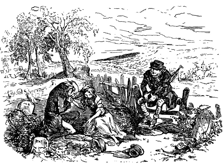 Дряхлому сторожу скоро полегчало, и он снова стал выходить. От него девочка тоже узнала много нового для себя, хотя рассказы этого старика были несколько иного порядка. Работать он еще не мог, но однажды, когда на кладбище понадобилась свежая могила, пришел посмотреть, как ее роют. В тот день старику, видно, хотелось поболтать, и Нелл вступила с ним в разговор, сначала стоя рядом, а потом сев на траву и подняв к нему свое серьезное личико.