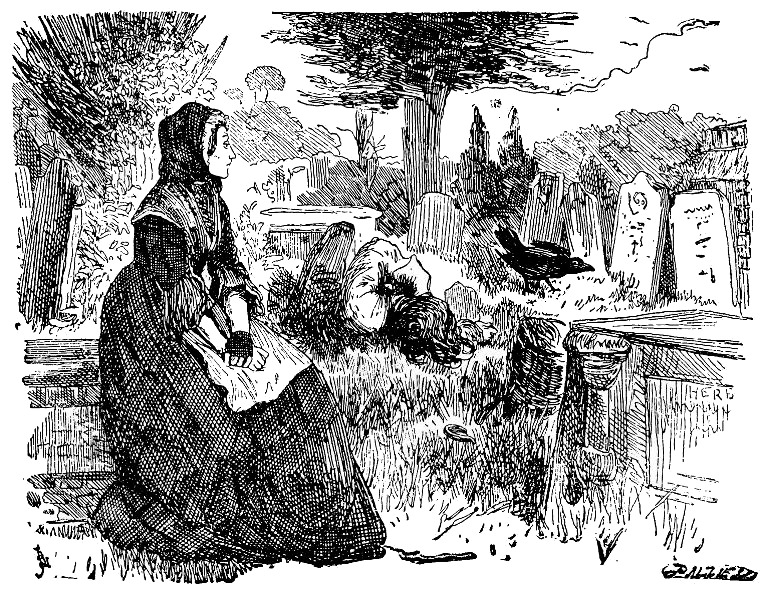 Это деревенское кладбище, тихий и красивый уголок, для матери Барнеби было связано с печальными воспоминаниями: здесь был похоронен мистер Рубен Хардейл, а близ склепа, в котором покоился его прах, стоял памятник ее мужу, и краткая надпись поясняла, когда и как он погиб. Вдова, задумавшись, сидела здесь, пока отдаленный звук рожка не возвестил о приближении дилижанса. Как только затрубил рожок, спавший на траве Барнеби мигом вскочил, а Грип, тоже как будто понимая, что означает этот звук, сразу же полез в свою корзину и принялся оттуда умолять всех вообще «никогда не вешать носа и не трусить», как бы иронически намекая на одолевающий людей на кладбище страх смерти. Скоро вся компания уже сидела на крыше дилижанса и катила по дороге в Лондон.