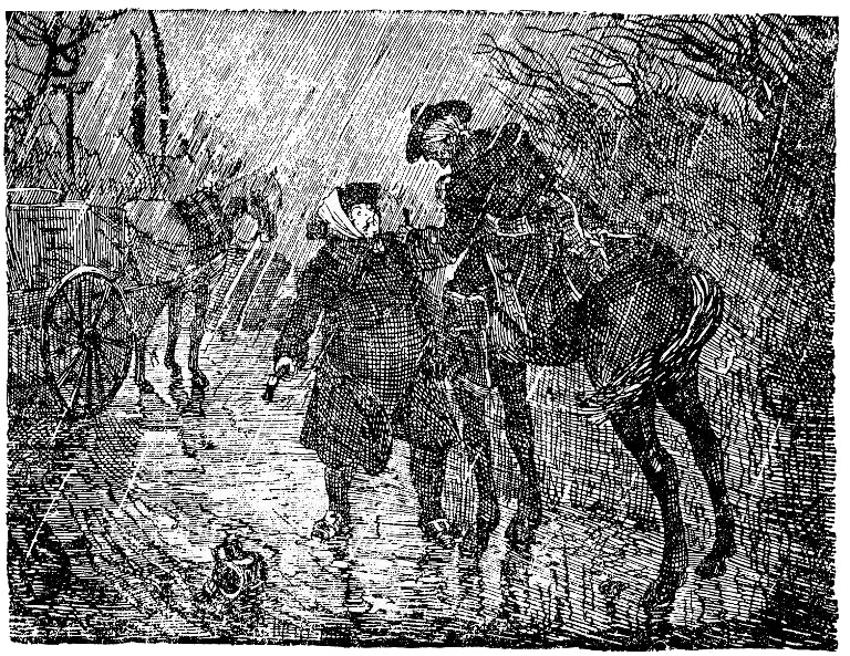 – У вас, я вижу, есть фонарь, – сказал всадник, сойдя с лошади, – дайте-ка его сюда на минутку! Кажется, вы ушибли мою лошадь колесом или оглоблей.