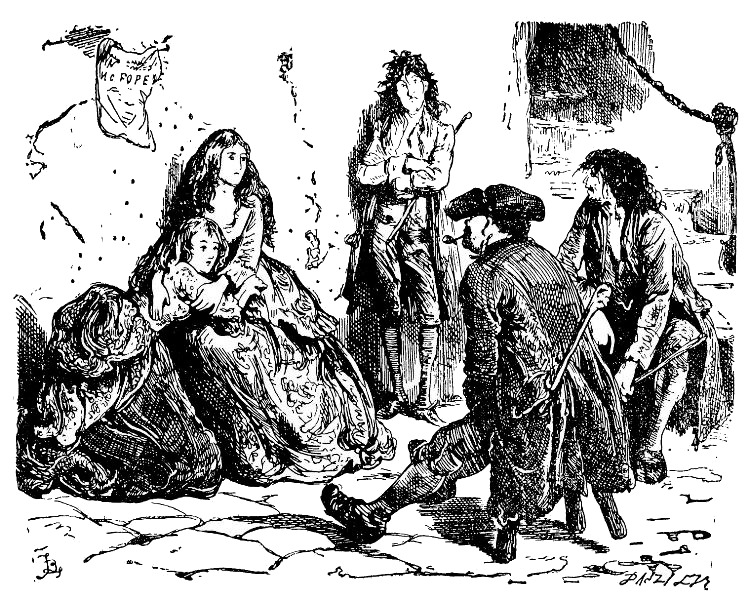 Такая же паника царила не только в глухих местах, вроде Чигуэлла, где люди невежественны, беззащитны и потому боязливы. Подъезжая к Лондону в сером свете утра, путники наши встречали целые семьи несчастных католиков: до смерти напуганные угрозами бунтовщиков и предостережениями соседей, они ушли из города пешком и без вещей, так как не могли достать ни единой телеги или лошади, чтобы увезти свое добро, и вынуждены были все оставить на произвол судьбы. Близ Майл-Энда мистеру Хардейлу и его спутникам пришлось проезжать мимо дома, хозяин которого, небогатый католик, нанял фургон, рассчитывая в полночь увезти свою мебель, и уже заранее вытащил все на улицу, чтобы по прибытии фургона не терять времени. Но фургонщик, с которым он сговорился, увидев пожары и промчавшуюся мимо его дома орду бунтовщиков, побоялся везти вещи католика, и теперь несчастный джентльмен с женой, маленькими детьми и служанкой сидели на пожитках под открытым небом, с трепетом встречая наступающий день, не зная, куда кинуться, что предпринять.