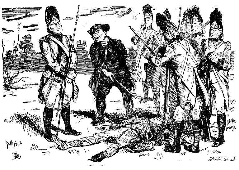 Сержант вывернул карманы убитого и, вытряхнув их содержимое на траву, насчитал, кроме каких-то иностранных монет и двух колец, сорок пять золотых гиней. Все это завязали в носовой платок и унесли, а тело пока оставили на месте, поручив шестерке солдат под начальством сержанта отнести его в ближайшую харчевню.