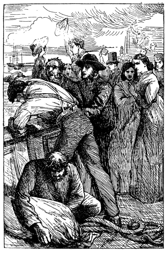 Вот он! Все взоры устремлены на пакетбот, очертания которого расплываются в сгущающемся тумане зимнего дня; все указывают рукой в одном направлении» и со всех сторон слышны удивленные и восторженные возгласы: «О, какой красивый!», «Какой нарядный!» Даже ленивый джентльмен в шляпе набекрень, который весьма успокоительно подействовал на многих, когда, засунув руки в карманы и позевывая, с небрежным видом спросил другого джентльмена, не едет ли и он «на ту сторону», точно речь шла о переправе через реку на пароме, – даже и этот джентльмен снисходительно бросает взгляд на пакетбот и кивает головой, как бы говоря: «Ну, тут дело чистое». Думается, сам премудрый лорд Бэрли[7]7