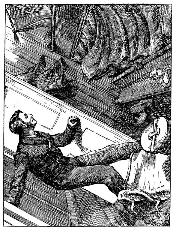 Настает третье утро. Меня пробуждает ото сна отчаянный крик моей жены, желающей знать, не грозит ли нам опасность. Я приподымаюсь и выглядываю из постели. Кувшин с водой ныряет и прыгает, как резвый дельфин; все небольшие предметы плавают, за исключением моих башмаков, севших на мель на саквояже, словно пара угольных барж. Внезапно они у меня на глазах подскакивают в воздух, а зеркало, прибитое к стене, прочно прилипает к потолку. В то же время дверь совсем исчезает и в полу открывается другая. Тогда я начинаю понимать, что каюта стоит вверх ногами.