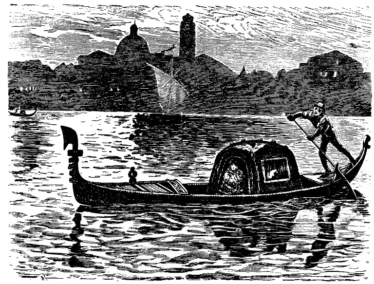 Так мы проникали все дальше в этот призрачный город по узким улицам и переулкам, где всюду высоко стояла вода. В иных местах, где нам требовалось сворачивать, было настолько тесно и повороты были такими крутыми, что казалось просто немыслимым, чтобы наша длинная лодка могла там повернуть. Но гребцы тихим мелодическим выкриком предупреждали о себе встречных и, не останавливаясь, направляли ее в нужную сторону. Иногда гребцы с какой-нибудь другой черной лодки, похожей на нашу, отзывались на этот выкрик и, убавив ход (мне казалось, что и мы делали то же), проносились мимо нас как черная тень.
