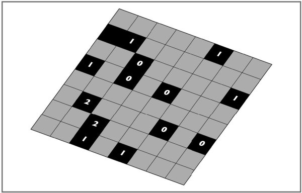 В некоторых темных квадратах есть числа, указывающие, сколько лампочек находится в квадратах вверху, внизу, справа или слева от данного квадрата.
