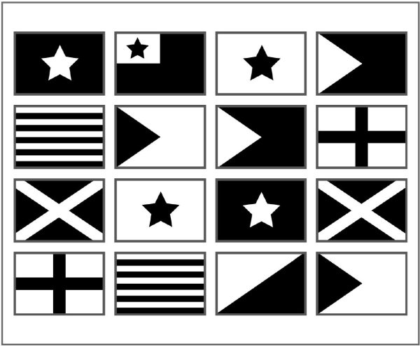 Вам предложили недельку поработать в посольстве, но чтобы получить эту вакансию, вам придется доказать, что ваша кратковременная память готова к работе. Для этого нужно блестяще справиться с этим тестом. Ваша задача – изучить таблицу флагов, затем закрыть ее и ответить на вопросы. Возьмите лист бумаги или откройте раздел примечаний и заметок в конце книги, чтобы записать свои ответы.