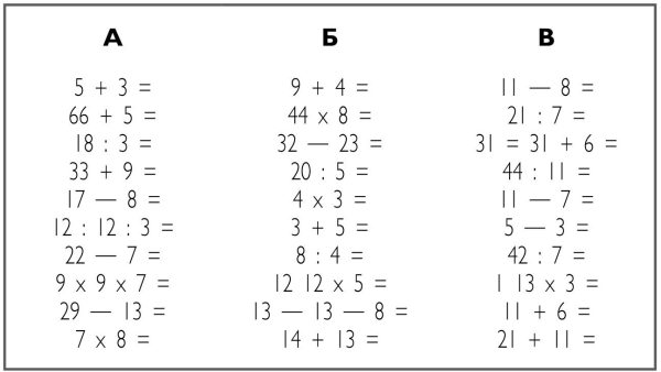Вот краткий тест на скорость выполнения арифметических действий. Проделайте эти вычисления как можно быстрее. Засеките время с помощью секундомера. Постарайтесь побить рекорд, уложившись меньше чем в предложенную 1 минуту.