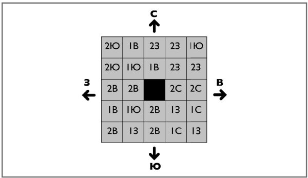 Бывший однокашник, которого вы давным-давно потеряли из виду, присылает вам таблицу, которая указывает местонахождение спрятанного «сундучка с сувенирами», где лежат повседневные мелочи времен вашего детства. Сундучок прячется под центральным темным квадратом таблицы. Чтобы добраться до него, вы должны сдвигаться на указанное число клеток к северу, югу, востоку и западу – например, 3з означает, что нужно сдвинуться на 3 клетки к западу. На каждой клетке вы должны остановиться только раз. Удастся ли вам сообразить, с какого квадрата начинать?