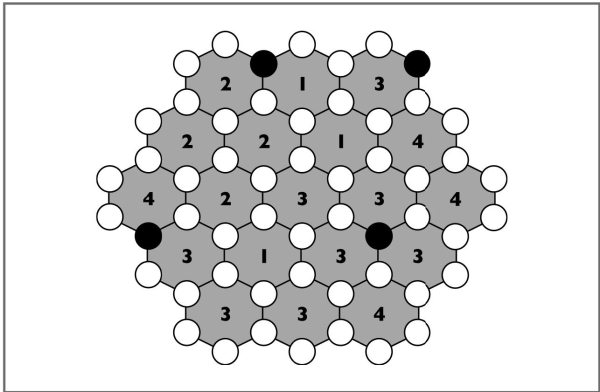 Правило такое: каждый из кружков, окружающих территорию с числом больше единицы, должен стоять рядом с другим заштрихованным кружком.