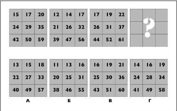 Который из представленных в нижнем ряду вариантов – А, Б, В или Г – воспроизводит принцип первых трех числовых квадратов в верхней последовательности? Как вы уже знаете из предисловия, стимуляция мозга способствует росту новых мозговых клеток и новых связей между ними – что надежно защищает будущее здоровье вашего мозга и долгую превосходную работу памяти.