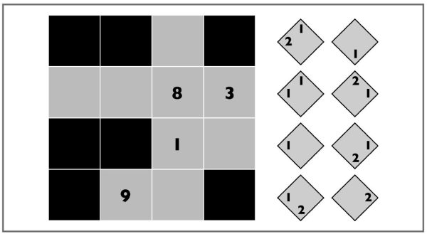 На этот раз ваша задача – разместить числа от 1 до 9 в решетке так, чтобы можно было шагать от одного числа к следующему по порядку, пользуясь данными подсказками (например, цифры 2 и 1 в верхнем левом ромбике означают два шага влево, один вверх). Каждую «лесенку»-ромб можно использовать только раз. Нужно использовать обе части каждой подсказки, но порядок шагов может быть любым.