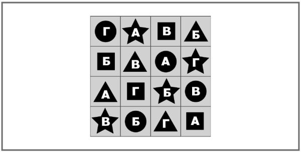 Законченная задача показана ниже; в каждой колонке, длинной диагонали и ряду содержатся 4 различные фигуры и буквы от А до Г. Если вы любите выпить пивка в компании друзей, то для вас есть хорошие новости: исследование 2011 года, проведенное в Маннгейме (Германия), показало, что у пожилых людей, которые ежедневно выпивали в компании бокал вина или пинту пива, деменция развивалась с вероятностью на 30% ниже, чем у остальных.