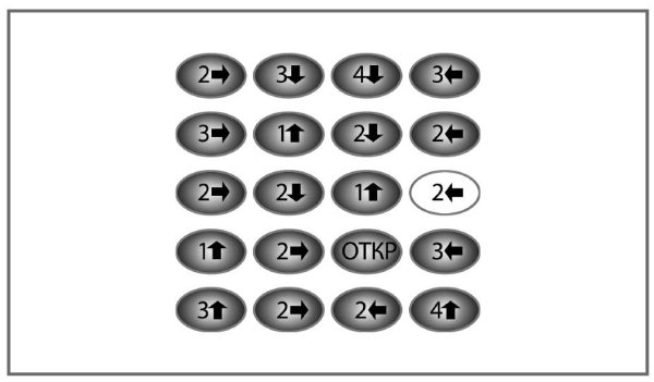 Темно-фиолетовый – вверх; белый – влево; фиолетовый – вправо; светло-фиолетовый – вниз. Последней костью на вашем маршруте будет белая 2, четвертая кость в четвертом ряду.