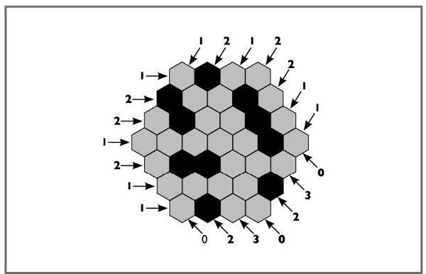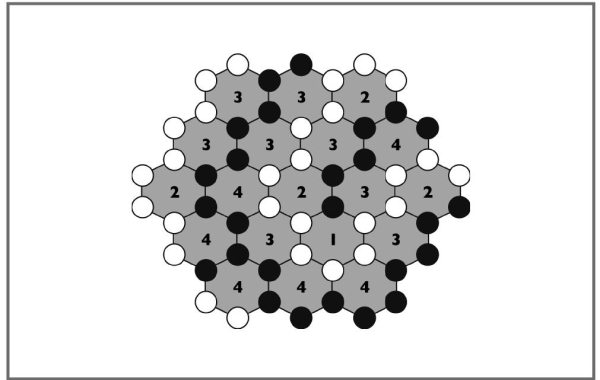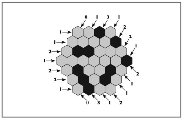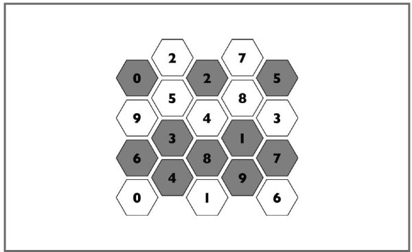 Завершенная схема «морского боя» показана внизу. Мне кажется, что «сотовое» расположение делает этот вариант игры труднее обычного: такое расположение кораблей не так легко визуализировать, как простые горизонтальные и вертикальные группировки.