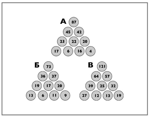 Завершенные числовые пирамиды показаны ниже. Эта задача разработана для того, чтобы наращивать скорость мышления и уверенность в работе с числами, нужными для манипуляций с числами в кратковременной памяти. Дополнительное задание: ответ, что очевидно, варьируется в зависимости от даты вашего рождения; в моем случае (2 декабря, т. е. 0212) верхнее число пирамиды – 11.