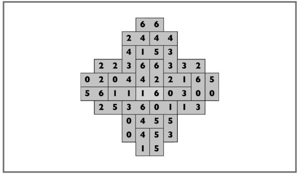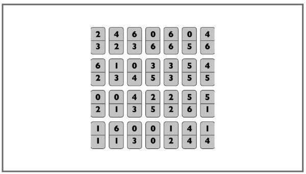 Чтобы увидеть правильное расположение костяшек домино, рассмотрите их в следующей колонке текста. «Карта домино» – это вариант задачи «Доминология» (см. задачу 65); и та, и другая тестируют логику, внимание к деталям и пространственный интеллект.